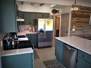 The home has a fully stocked kitchen with a full size refrigerator, stove, microwave, and dishwasher; dishes and cookware provided. The lower level has a master bedroom with a king size bed, tv and a full bath. The upper two bedrooms have three twin beds and a tv in each bedroom and share the full bathroom that is upstairs as well. We provide bedding, towels and soaps. This home has all the extras for your comfort, including in-floor heating and air conditioning.The patio doors in the living room open to a large patio and invite you to build a fire, dine al fresco, and appreciate and enjoy the beauty and wildlife of the area.